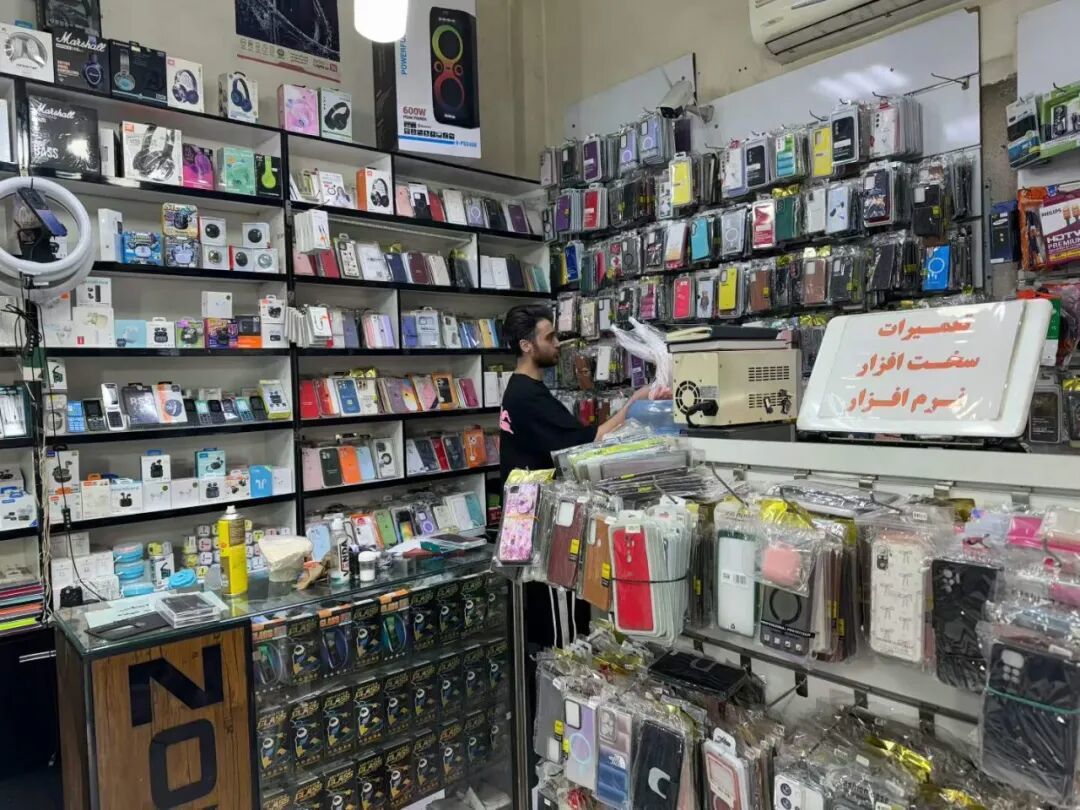 我的苹果手机钢化膜裂了,就顺便在旁边卖手机零件的店里换了膜。另一部三星手机是专门接伊朗电话的,手机壳也裂了,我也顺便在这家店换了一个手机壳。